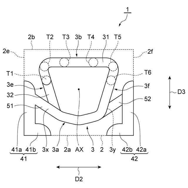前記コイルのコイル軸は、前記第一側面及び前記第二側面の対向方向に沿って延び、