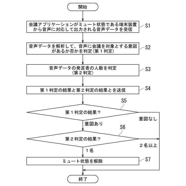 前記音声に前記会議を対象とする意図があると判定され、且つ前記音声データの発言者の人数が1名であると判定された場合に、前記ミュート状態を解除する工程と