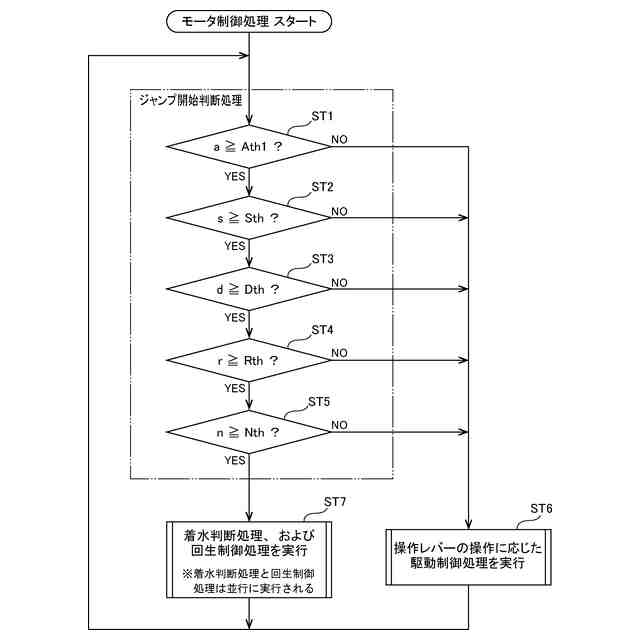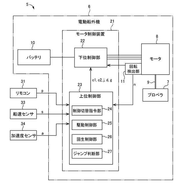 【解決手段】モータ制御装置21は電動船外機6のモータ8を制御する装置である。モータ制御装置21は、モータ8の駆動制御を行い、電動船外機6のプロペラ7を回転させる駆動制御部25と、船舶1がジャンプしたか否かを判断するジャンプ判断部27と、ジャンプ判断部27の判断の結果、船舶1がジャンプしたとき、モータ8の回生制御を行う回生制御部26とを備えている。