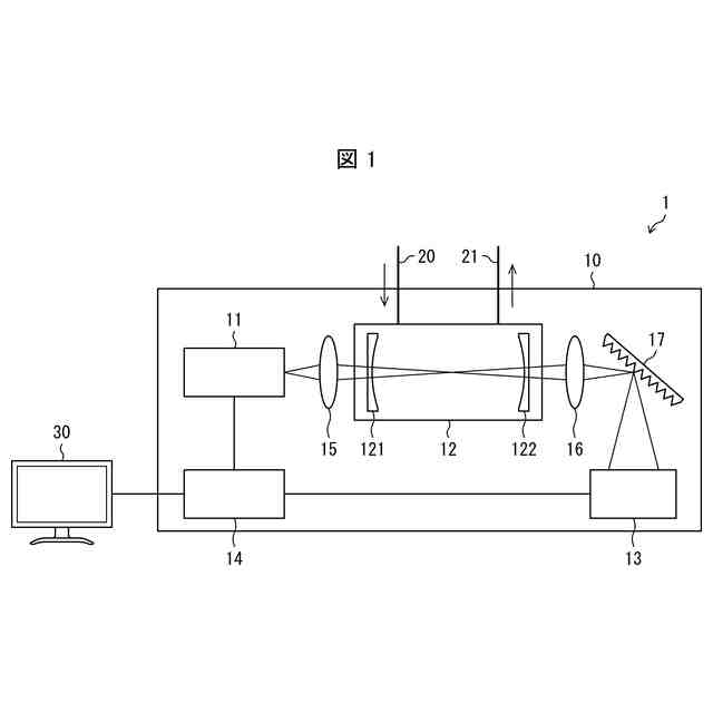 近年、生体ガスと呼ばれる人体が発するガス(呼気、皮膚ガスまたは腸内ガスなど)に含まれる特定の成分の濃度が、特定の病状と相関を示すことが明らかとなりつつある。当該ガス成分の濃度は体積比でppbからppm(10億分の1から100万分の1)という極低濃度の領域で変化する。このような極低濃度のガスを定量的に検出する技術として、キャビティ増幅吸収分光法が挙げられる。当該分光法は、高反射率の二枚の反射鏡を向かい合わせにした構成(「光キャビティ」とも呼ばれる)によって、反射鏡間を光が何往復もすることで実効的な光路長を長くし、極低濃度のガスによる光の吸収を増幅させる方法である。