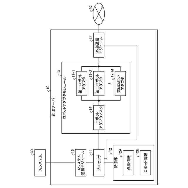 【解決手段】管理サーバ10は、ロボットアダプタモジュール13を有し、機種が互いに異なるロボットを含む第一ロボット20-1,第二ロボット20-2,…,第Nロボット20-Nを管理し、ロボットアダプタモジュール13は、点検作業の作業情報データを第一ロボット20-1,第二ロボット20-2,…,第Nロボット20-Nのそれぞれの機種に応じた特定の形式の命令に変換し、点検作業を行うロボットの機種に応じた特定の形式に変換後の命令を第一ロボット20-1,第二ロボット20-2,…,第Nロボット20-Nのうち点検作業を行うロボットへ送信する。