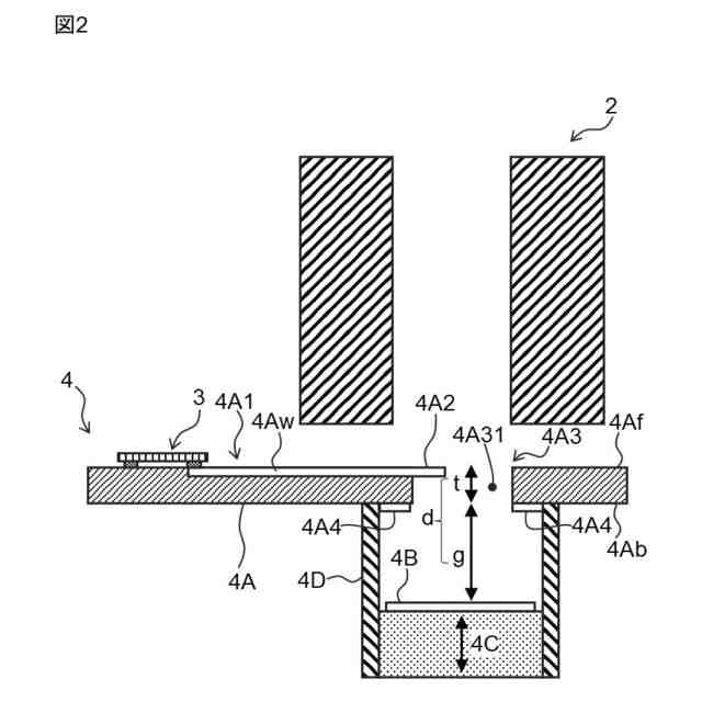 前記配置空間部における前記基板部材の厚みtと、前記基板部材の前記うら面と前記金属部材との間の距離gとを合わせた長さをdとしたとき、