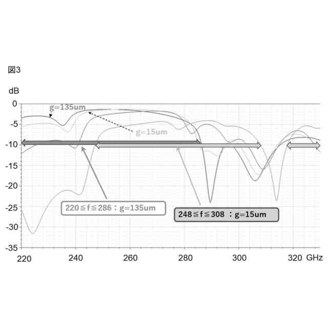 図3は、距離gを135μmから15μmまで変動させていったときの電波の減衰特性の変化を示したグラフである。