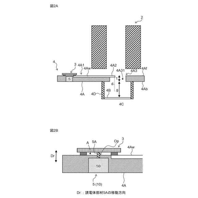図2Aは、図1に示す導波管変換装置100の導波管2、ICチップ3、通信装置4、アクチュエータ5といった構成を模式的に示した説明図である。図2Bは、ICチップ3及びアクチュエータ5等を拡大した状態を模式的に示した説明図である。なお、図2Bにおいて、方向Drは、誘電体部材5Aの移動方向(ICチップ3に近接するときに移動する方向)である。