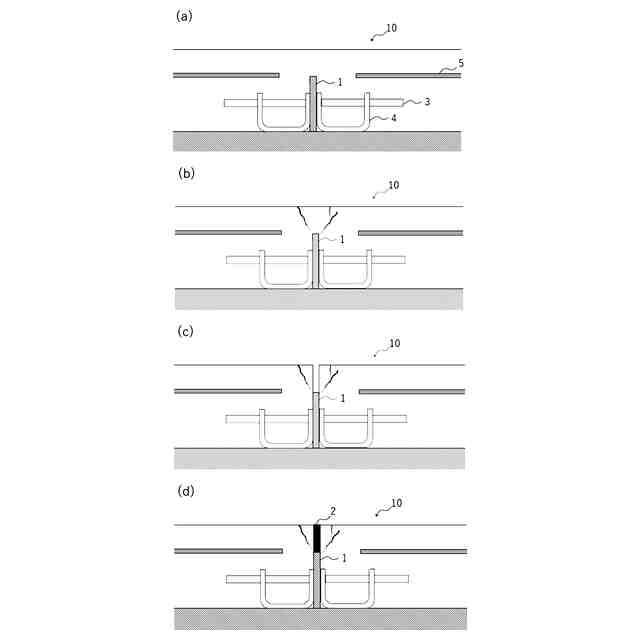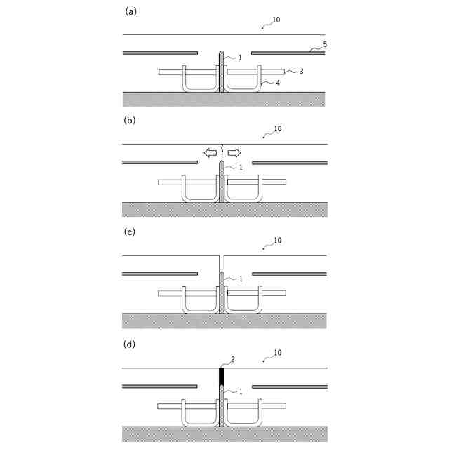 コンクリート舗装の目地の他の形成方法としては、杉板等の目地板を予め設置しておき、コンクリートをその上から打設した後、コンクリートの硬化後に目地板上部のコンクリートをコンクリートカッターで切断除去して空隙を作り、その空隙に防水性の目地充填材を入れる方法が知られている。