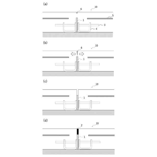 コンクリート舗装の目地の他の形成方法としては、杉板等の目地板を予め設置しておき、コンクリートをその上から打設した後、コンクリートの硬化後に目地板上部のコンクリートをコンクリートカッターで切断除去して空隙を作り、その空隙に防水性の目地充填材を入れる方法が知られている。
