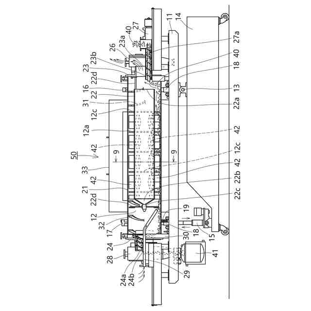 この種の回転円筒型反応装置では回転円筒体に供給した原料が詰まることなく軸心方向に沿って供給口側から排出口側へ移動する充填量は回転円筒体の傾斜角度にもよるが、ほぼ円筒体の断面積の30%位が限度である。供給した原料は円筒体の底部に沿って移動し、回転円筒体の上部には原料の存在しない断面積70%の空間が形成される。