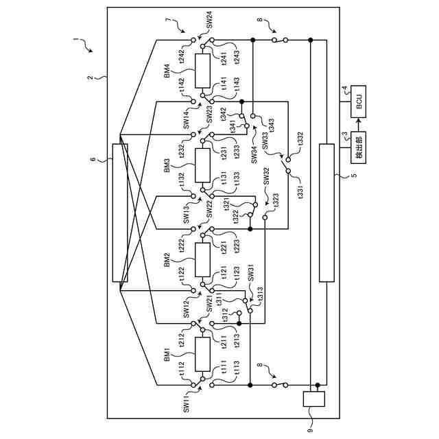 図1は、実施形態1に係る電力制御装置を含む車両の概略的な構成を表す図である。車両1は、電気回路2と、検出部3と、BCU(Battery Control Unit)4と、走行用モータ5と、補機6と、バッテリモジュールBM1~BM4と、を備える。電気回路2は、切替部7と、リレー8と、DCDCコンバータ9と、を備える。