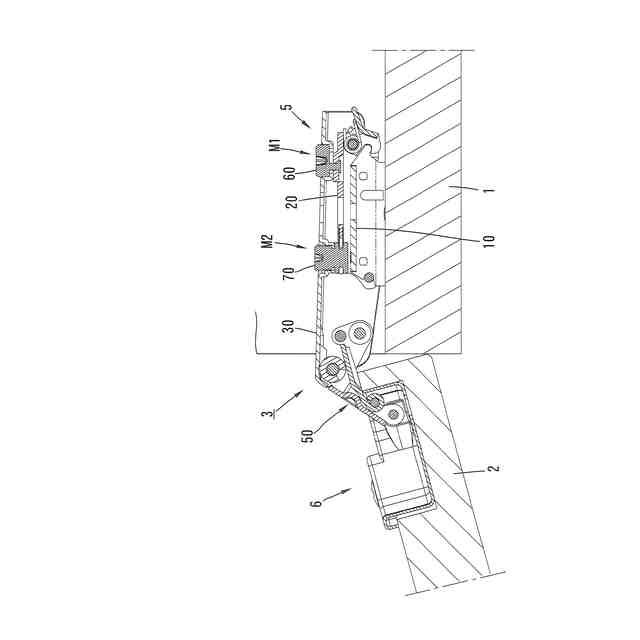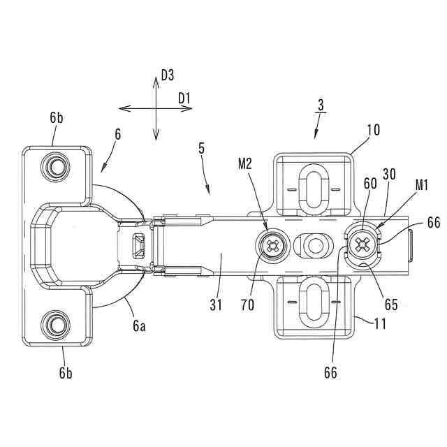 第1ヒンジ本体5と第2ヒンジ本体6と連結機構50が、第1方向D1に沿って配置される。第1ヒンジ本体5は、サポート部材20と、サポート部材20に第1、第2位置調節機構M1,M2を介して支持された主ヒンジ部材30とを有している。第1位置調節機構M1は、主ヒンジ部材を第1方向D1に位置調節する。第2位置調節機構M2は、主ヒンジ部材30をサポート部材20に対して接近・離間する第2方向に位置調節し、主ヒンジ部材30の雌ネジ部71と調節ネジ70を含む。サポート部材20のネジ支持部76と、調節ネジ70の係合部74が係合される。調節ネジ70はストッパとしてのフランジ部72を有している。雌ネジ部75の先端75a(当接部)がフランジ部72に当たることにより、調節ネジ70のねじ込み量が規制される。