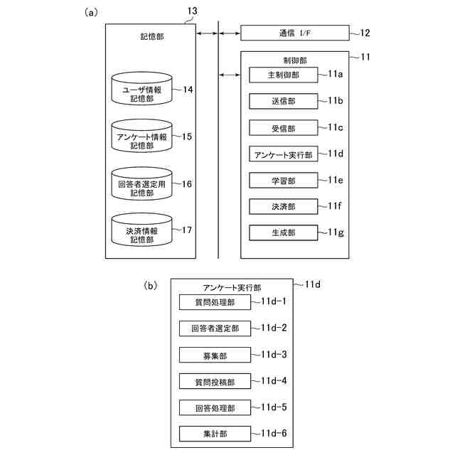 前記アンケート実行部は、さらに回答者のユーザIDに紐づく全てのカラムによって予め機械学習により算出された特徴量、採用された回答を提供した回答者のユーザIDに紐づくカラムによって予め機械学習により算出された特徴量、及び前記特徴量により機械学習により算出された各ユーザの各カテゴリに対するスコアリング結果に基づいて、前記回答者の選定を行う