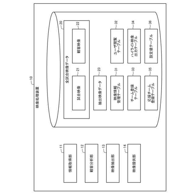 本開示における映像処理装置10は、スポーツの映像を提供するサービスを行っている事業者によって運営され、スポーツの映像のハイライト映像を抽出し、ユーザに対して提供する機能を有する。特に、本実施形態では、選手が映る試合自体の内容を撮影した試合映像のハイライト映像を抽出する際に、試合を観戦する観客を撮影した観客映像に基づいて抽出することとする。ここで、本実施形態では、映像を撮影するスポーツの試合は、サッカーの試合である場合を一例に挙げて説明し、このとき、ホームグラウンドのチームとアウェイのチームとが対戦することとする。但し、本開示では、ハイライト映像を抽出する対象となる映像は、スポーツの試合の映像であることに限らず、演劇や演奏などのいかなる興行の内容を撮影した映像であってもよく、この場合、ハイライト映像の抽出の際に、演劇や演奏などの興行を観覧している観客を撮影した観客映像を用いることとする。