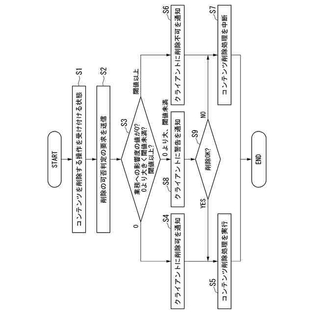 本開示の別の態様によれば、プログラムは、コンピュータに、コンテンツへアクセス可能なユーザの数であるアクセス可能者数に対する実際にアクセスしたユーザ数であるアクセス者数の比を他者への影響度として算出することと、前記他者への影響度に基づいて、前記コンテンツの削除に係る判定を行うことと、を実行させる。