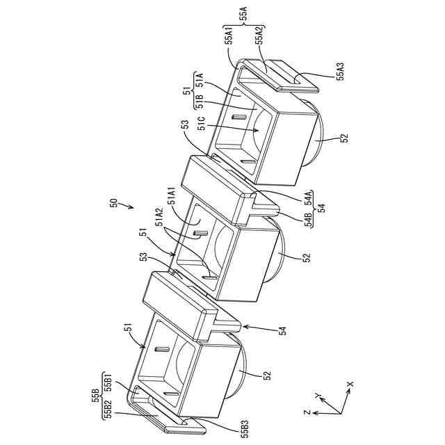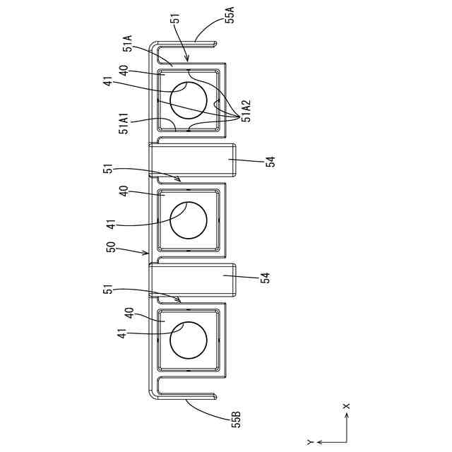 各前記端子は、端子接続部と、前記端子接続部を前記第1方向に直交する第2方向に貫通する挿通孔と、を有し、