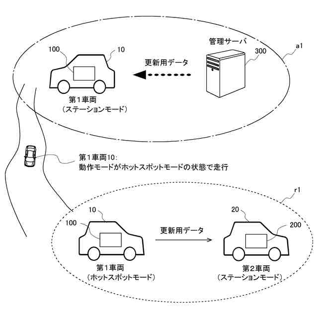 車両において使用されるソフトウェアがOTAよって更新される場合、更新対象の車両に対して外部サーバから更新用データが配信されるのが一般的である。この場合、外部サーバから車両が更新用データを受信するためには、外部サーバとの通信が可能なエリア内に車両が存在する必要がある。つまり、外部サーバとの通信が可能なエリアの外に存在する車両ではソフトウェアを更新することができない。そこで、本開示は、車両において使用されるソフトウェアの更新をより速やかに広範囲で促進させるために、車車間通信によって更新用データを授受するための技術を提供する。