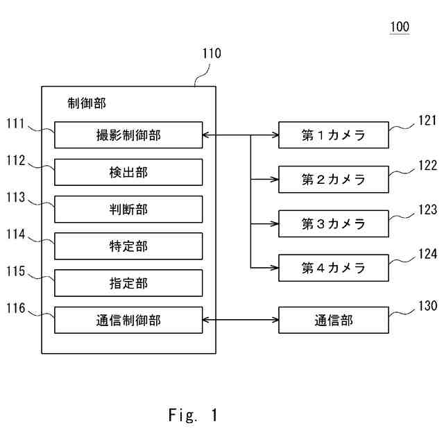 図1に、本発明の実施形態1に係る物体検出システム100の構成の一例を示す。物体検出システム100は、図1に示すように、制御部110と、第1カメラ121、第2カメラ122、第3カメラ123、第4カメラ124と、通信部130とを備える。