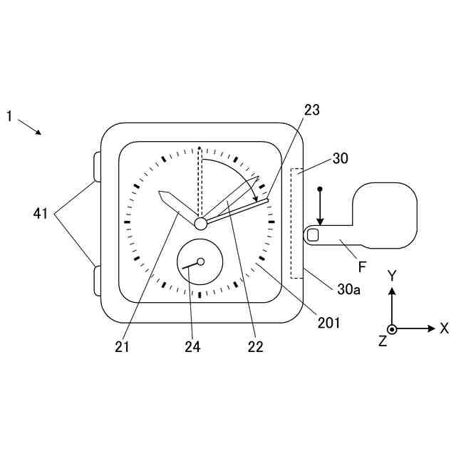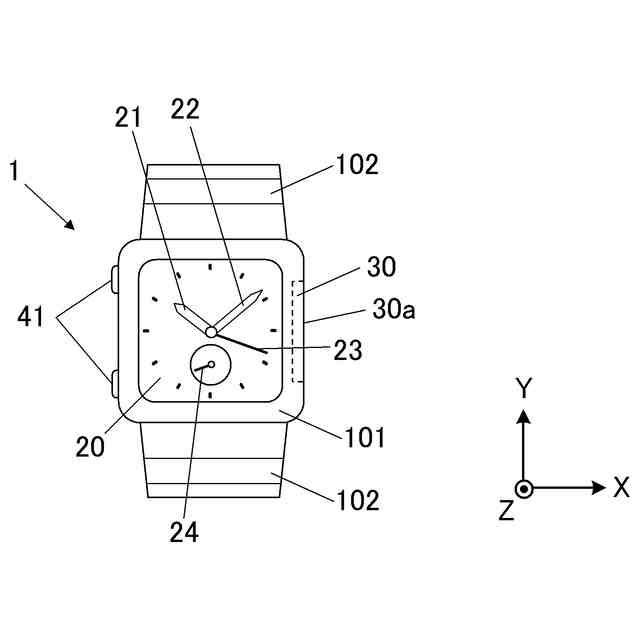 以下、本発明の実施の形態を図面に基づいて説明する。図1に示すように、電子時計1は、アナログ表示部20及び図示略の回路基板等が内部に格納された筐体101と、筐体101に取り付けられた2本のバンド102とを備える。電子時計1は、バンド102を手首に巻き回すことでユーザの手首に装着されて用いられる腕時計である。以下では、アナログ表示部20の文字板に平行かつアナログ表示部20の文字板の中央から3時方向に向かう方向を+X方向とし、文字板に平行かつ文字板の中央から12時方向に向かう方向を+Y方向とし、文字板の法線方向を+Z方向とする。筐体101は、+Z方向から見て角が丸みを帯びた矩形である。筐体101の+X方向側の側面には、ユーザの指等の操作手段によるタッチ操作を検出可能なタッチ操作部30(タッチパネル)が設けられている。図2に示すように、タッチ操作部30は、+X方向から見てY方向に延びる略平面状の操作面30aを有する。筐体101の-X方向側の側面には、押下操作が可能な操作ボタン41が設けられている。なお、筐体101の形状は、略矩形に限られない。例えば、筐体101は、+Z方向から見て略円形等であってもよく、タッチ操作部30の操作面30aは、筐体101の形状に応じて湾曲していてもよい。