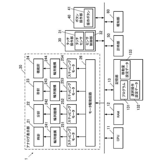 図3に示すように、電子時計1は、CPU11(Central Processing Unit)(制御部、制御手段)と、RAM12(Random Access Memory)と、記憶部13と、アナログ表示部20と、タッチ操作部30と、ボタン操作部40と、計時部50と、報知部60と、を備える。電子時計1の各部は、バス等のデータ伝送経路を介して接続されている。