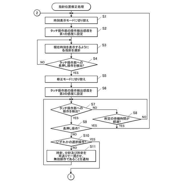 前記制御部は、前記修正対象の指針を特定した後に、前記タッチ操作部に対する所定の第1操作を検出した場合に、前記第1操作の操作量に応じて前記修正対象の指針を運針させることで前記修正対象の指針の位置を修正する、
