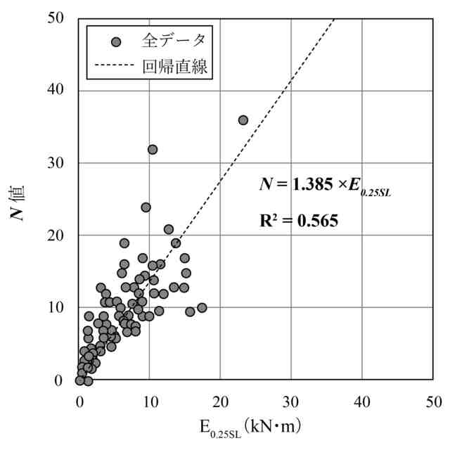 特許文献3に示された方法に基づく液状化判定方法においては、SDS試験で得られたデータからN値や細粒分含有率の推定値を求めることから、標準貫入試験やSWS試験による場合に比べ、試料の採取や室内土質試験を要せずに液状化判定を行うことができる利点がある。しかし、重回帰分析を行うための説明変数となるパラメータが複数存在するため、試験データによっては値の増減が大きくなり、推定値の信頼性を低下させる可能性が考えられた。特に試験データによっては0.25mの貫入に要するエネルギーE