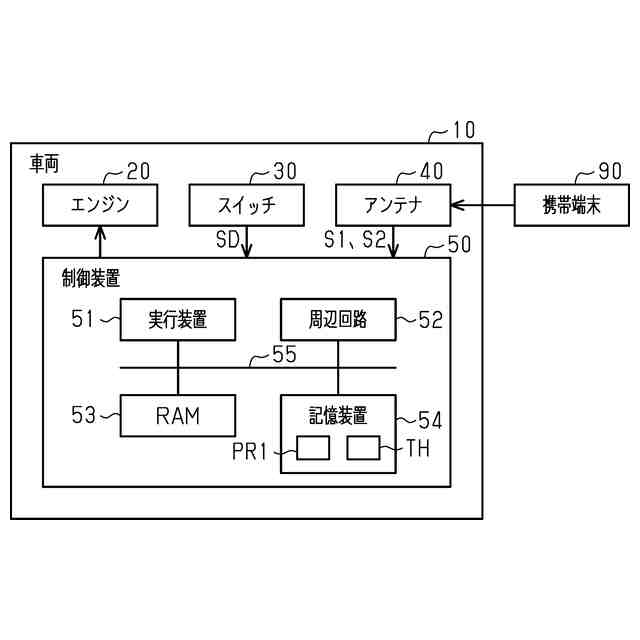 アンテナ40は、車両10に搭載されている。アンテナ40は、携帯端末90から送信された信号を受信する。本実施形態では、携帯端末90は、デジタルキーを有する携帯電話である。アンテナ40は、携帯端末90から受信した信号の強度を示す強度信号SSを制御装置50へ出力する。制御装置50は、スイッチ30から始動要求SDを示す信号を取得する。制御装置50は、アンテナ40から強度信号SSを取得する。制御装置50は、取得した信号に基づいて、エンジン20を制御する。