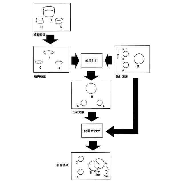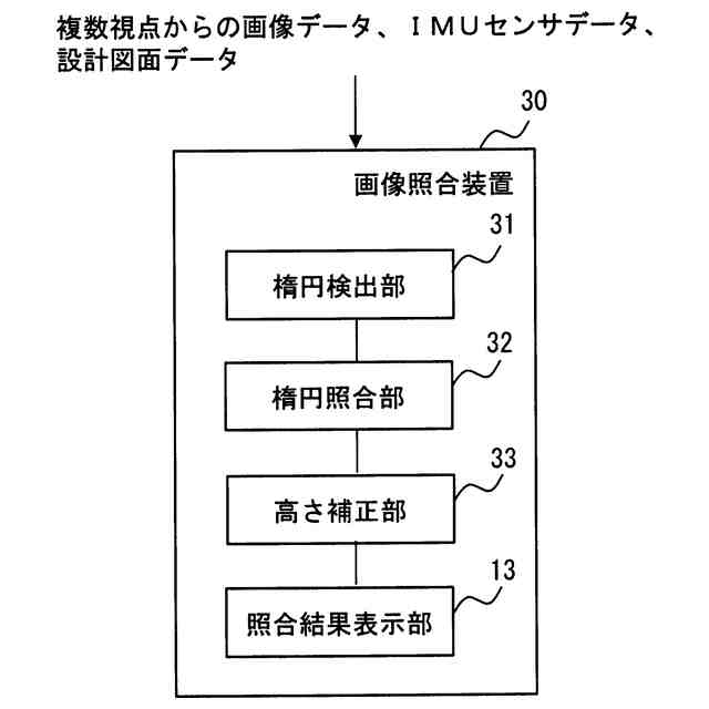 【解決手段】画像照合装置は、複数のスリーブが撮影された画像から各スリーブについて上面周囲の楕円を検出する楕円検出部と、検出された楕円と設計図面に示されたスリーブの円とを対応付け、対応関係から楕円を正面化し、正面化楕円と設計図面における円との位置誤差を計測する楕円照合部と、正面化楕円と設計図面における円とを表示する照合結果表示部とを含む。
