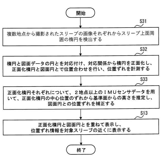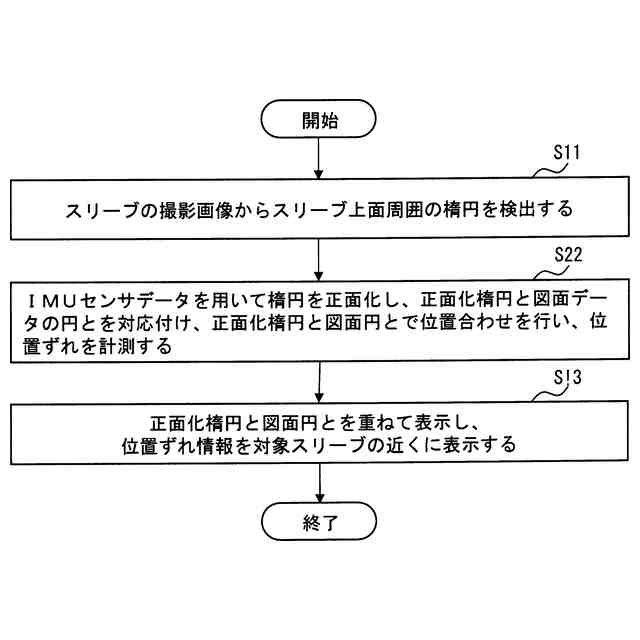 検出された前記楕円と設計図面に示されたスリーブの円とを対応付け、対応関係から前記楕円を正面化し、正面化楕円と前記設計図面における円との位置誤差を計測し、