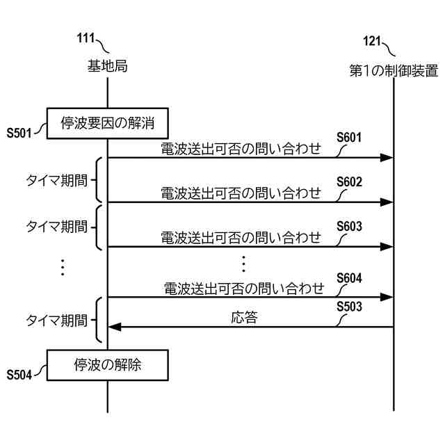 【解決手段】他の無線システムが使用する周波数帯を共用して無線通信を行うことが可能な無線通信システムにおける基地局装置は、無線通信システムに含まれる制御装置から、周波数帯を用いる電波の送出を停止すべきか否かを示す情報を受信し、その情報の受信、又は、その情報の受信と異なる他の所定の要因に基づいて、周波数帯を用いる電波の送出の停止と停止の解除とを行うように制御し、他の所定の要因に基づいて停止を行った後、他の所定の要因が解消したことに基づいて停止を解除する前に、制御装置から周波数帯を用いる電波の送出を停止すべきことを示す停止情報が通知されていないことの確認を行い、停止情報が通知されていないことが確認された場合は停止を解除し、停止情報が通知されていないことが確認されなかった場合は停止を維持するように制御する。