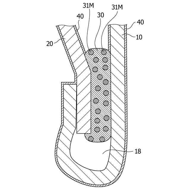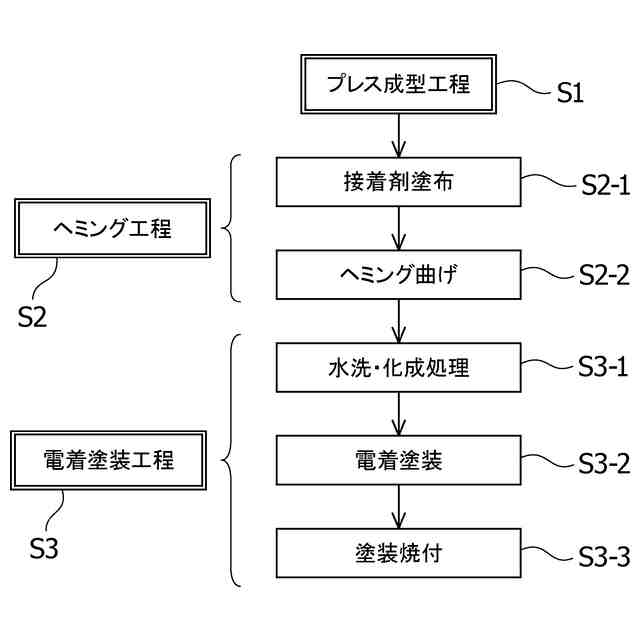 ヘミング部の構造は、図8に示すように、アウターパネル10が折り返されたヘミング曲げ内部18は、インナーパネル20と接着剤60によって袋構造の閉じられた空隙となっている。このヘミング曲げ内部18は、電着塗装工程において、空気が抜けないため電着液が入らず、電着塗装が施されにくい部位である。一方、ヘミング曲げ内部18に対して接着剤60を挟んだ反対側(図8の上側)は開放されており、電着液が入り電着塗装が施される部位となっている。