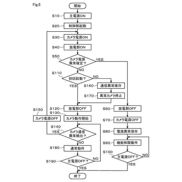 【解決手段】カメラ電源6は、カメラ4、5に供給する電源を生成する。放電部19は、カメラ電源6の生成電源を放電可能にしている。制御部20は、カメラ電源6及び放電部19の動作をそれぞれ有効/無効に切換可能にしている。過電流検出部21は、カメラ電源6の起動時に制御部20により放電部19を有効に動作させた状態でカメラ電源6の過電流を検出している。制御部20の異常検出部20bは、過電流検出部21の過電流検出結果に基づいてカメラ電源6の異常を検出する。
