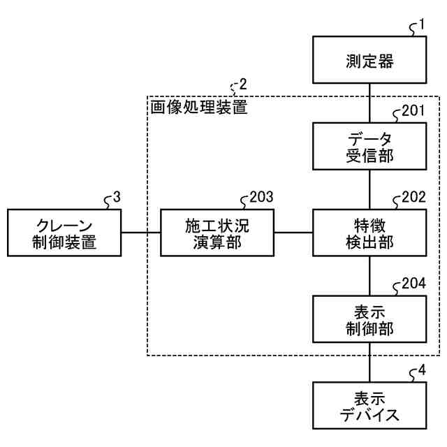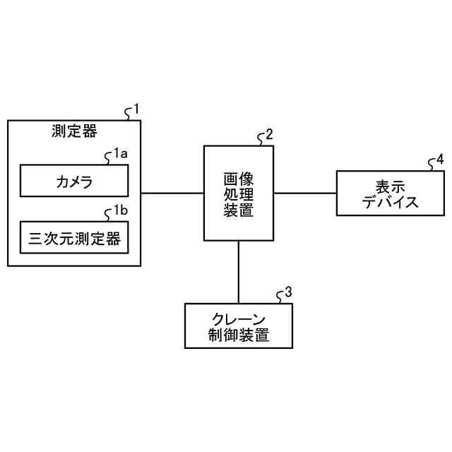 図1は、本実施の形態にかかるクレーンシステムのハードウェア構成の一例を示す図である。本実施の形態にかかるクレーンシステムは、図1に示すように、測定器1、画像処理装置2、クレーン制御装置3、および表示デバイス4を有する。本実施の形態では、測定器1、画像処理装置2、クレーン制御装置3、および表示デバイス4は、画像処理装置2を介して、互いに通信可能に接続されているが、通信ネットワークを介して互いに通信可能に接続されていても良い。ここで、通信ネットワークは、インターネット、移動体通信網、LAN(Local Area Network)等によって構築されている。通信ネットワークには、有線通信だけでなく、3G(3rd Generation)、WiMAX(Worldwide Interoperability for Microwave Access)、LTE(Long Term Evolution)等の無線通信によるネットワークが含まれても良い。