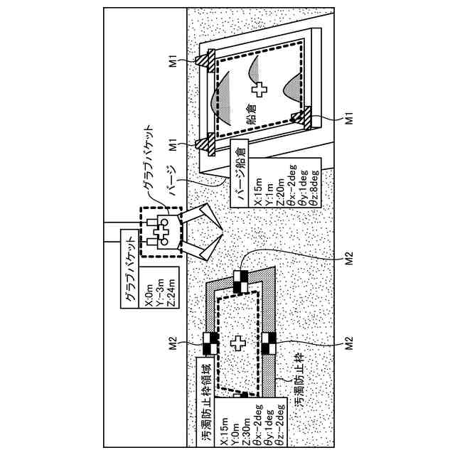 しかしながら、上記の技術では、グラブバケットによって所定水域の水底を掘削する浚渫作業において、波や風等の周辺環境の影響によって掘削作業場所、掘削した土砂を放土する場所が逐次変化するため自動化が難しく、熟練オペレーターによる操作が必要であり、改善の余地がある。