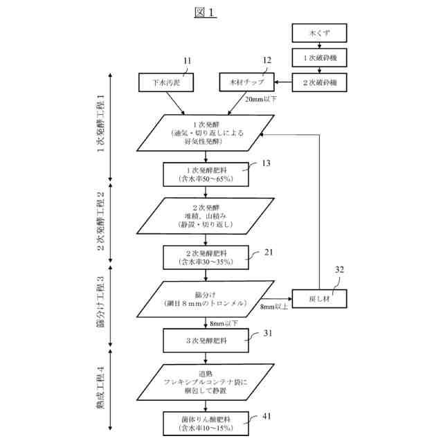 【解決手段】65~85%の含水率及び所定の重量に設定した下水汚泥11に、所定の破砕径及び所定の容量に設定した木材チップ12を混練し、得られた混錬材を発酵槽に投入し、60~80℃に維持しながら通気と切り返しを12~16日間行うことで、含水率を50~65%に調整した1次発酵肥料13を得る1次発酵工程1と、前記1次発酵肥料13を堆肥舎の発酵槽に山積みし、50~70℃に維持しながら静置と切り返しを12~16日間行うことで、含水率を30~35%に調整した2次発酵肥料21を得る2次発酵工程2と、前記2次発酵肥料21を篩分けして所定のサイズに整えた3次発酵肥料31を得る篩分け工程3と、前記3次発酵肥料31を、通気性を有するフレキシブルコンテナ袋に収納して1~2ヶ月間静置することで、含水率を10~15%に調整したりん酸肥料41を得る熟成工程4と、を有する。