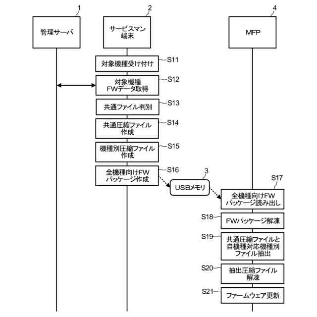 デバイスのファームウェアは、機種毎に異なる。そのため、デバイスのメーカ等において作成された機種毎ファームウェアデータが、当該メーカの管理サーバ等に準備され、サービスマンは、必要な機種毎ファームウェアデータを、管理サーバ等からダウンロードして、例えばUSB(Universal Serial Bus)メモリ等の可搬可能な記憶媒体に記憶させて、顧客先へ訪問することとなる。一つの顧客が一機種のみのデバイスを利用しているとは限らず、また、一度に複数の顧客先を回る場合も有るため、サービスマンは、複数機種用の機種毎ファームウェアデータを記憶媒体に記憶させることが必要となる。機種毎ファームウェアデータのサイズによっては、一つの記憶媒体に複数の機種用のデータを記憶させることができない場合もある。
