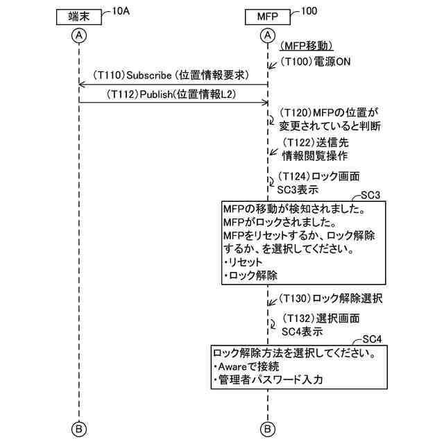 図1に示されるように、通信システム2は、複数個の端末10A,10Bと多機能機100とを備える。以下では、多機能機のことを「MFP(Multi-Function Peripheralの略)」と記載する。本実施例では、MFP100が、或る位置(例えばオフィスの所定の位置)に設置された後に、当該MFP100が別の位置(例えば引っ越し後の新たなオフィスの所定の位置)に設置される状況を想定している。