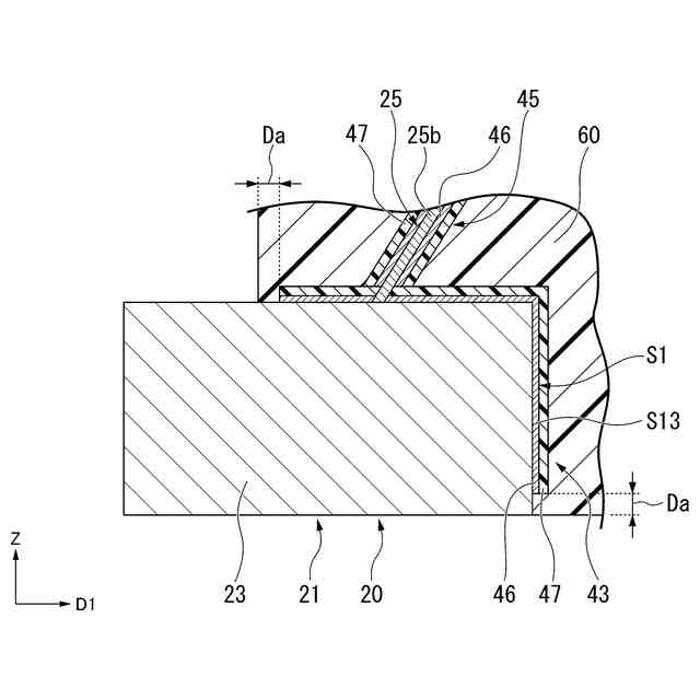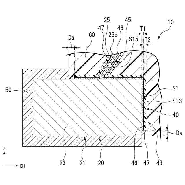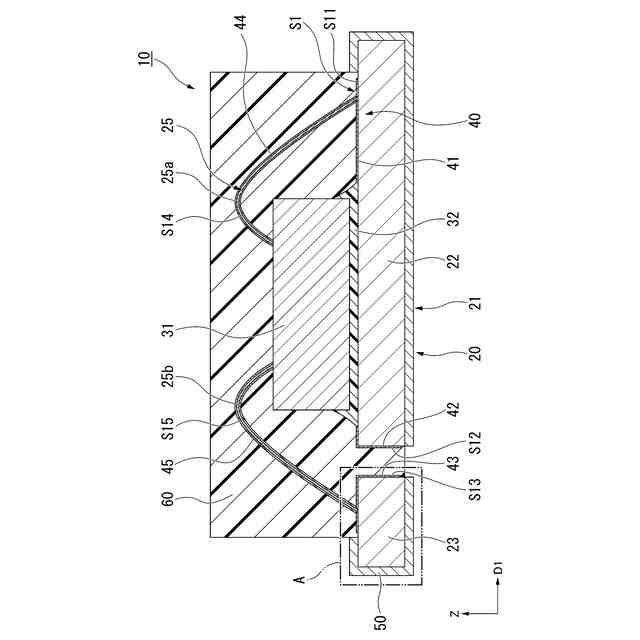図1は、本実施形態の半導体装置10を示す断面図である。図2は、実施形態の半導体装置10の一部を示す部分拡大断面図である。図2は、半導体装置10のうち図1において一点鎖線で囲むA部を示している。本実施形態の半導体装置10は、例えばMOSFET(metal-oxide-semiconductor field-effect transistor)およびIGBT(Insulated Gate Bipolar Transistor)等の半導体装置である。図1に示すように、本実施形態の半導体装置10は、半導体素子31と、端子20と、樹脂部60と、を備える。