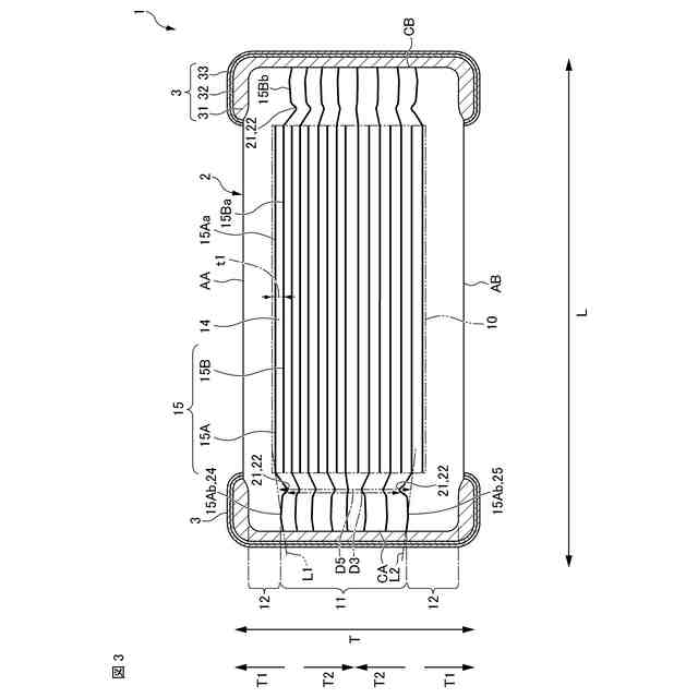 【解決手段】内部電極15は、積層方向Tに隣り合う内部電極15と対向する対向部15aと、対向部15aから引き出されるとともに外部電極3と接続される第1引出部15Abと、を有する。積層体2は、各対向部15aと、誘電体層14のうち隣り合う対向部15aに挟まれた部分と、からなる有効層部10を有する。第1引出部15Abは、積層方向中心側T2に頂点22を有するように屈曲する屈曲部21を有する。屈曲部21の頂点22と、有効層部10と、の長さ方向Lの最短距離は、誘電体層14の積層方向Tの寸法よりも大きく、当該屈曲部21の頂点22と、各端面Cのうち当該頂点22と近接する側の端面Cと、の長さ方向Lの最短距離よりも小さくなっている。