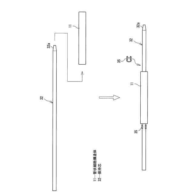 管状細胞構造体の内周面を支える棒状であり管状細胞構造体よりも長い保持芯と、