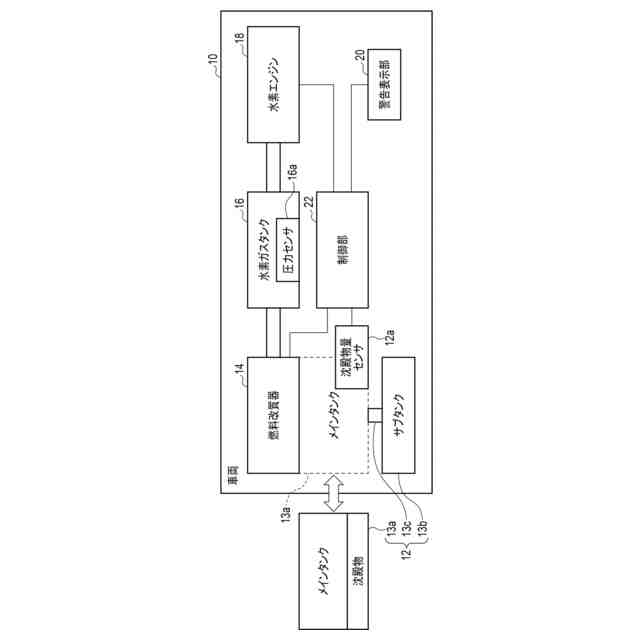 図1に示すように、車両10は、燃料タンク12と、燃料改質器14と、水素ガスタンク16と、水素エンジン18と、警告表示部(表示部)20と、制御部22とを備える。