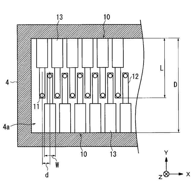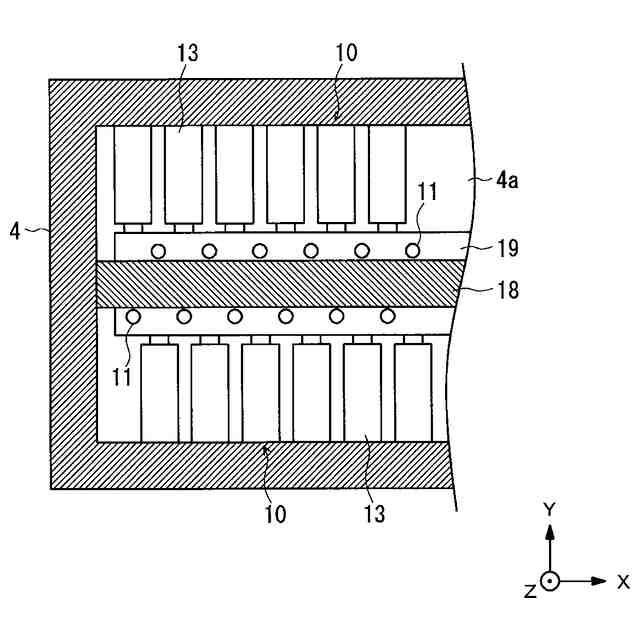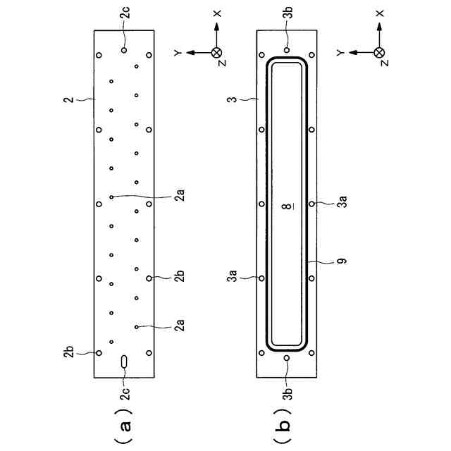図2は、ノズルプレート2のノズル配列について説明する概略図であり、ノズルプレート2をノズル面側から見た図である。ノズルプレート2としては、図2(a)に示すようにY方向の中央にノズル列を1列設ける構成や、図2(b)に示すようにY方向にノズル列を千鳥状で2列に設ける構成を採用できる。図2に示したノズル2aの配列は一例を挙げたものであり、例えばY方向に2列のノズル列を千鳥状に2組設けて合計4列のノズル列を有する構成や、X方向に同じ位置のノズル列を複数有するノズル列とする構成としてもよい。以下に説明する液体吐出ヘッド1は、図2(b)に示す構成を採用している。