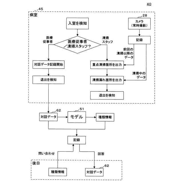 患者が入院中の病室45には、カメラ28が配置されている。カメラ28は、病室45内を常時撮影し、画像を記録する。カメラ28により撮影された画像、または、ドアに取り付けられたセンサ等により、病室45へ人が入室したことが検知される。顔認識等の手段により、入室した人が、医療従事者または清掃スタッフであるか否かが判定される。