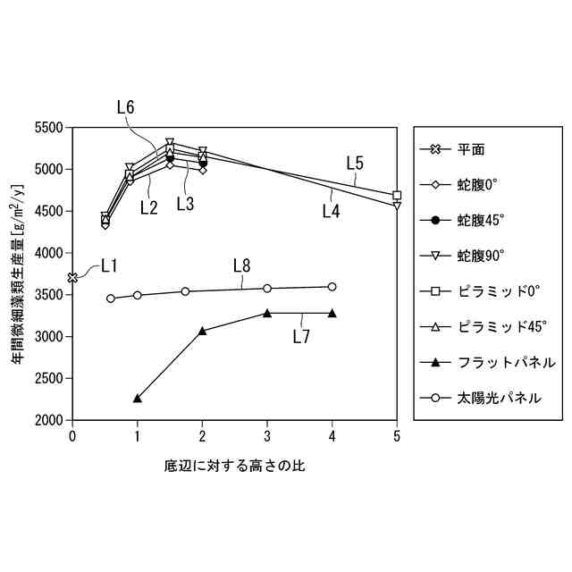 しかし、土地面積あたりの微細藻類の生産性を増加させるために、ただ土地面積あたりの培養面積を増やせばいいというものではない。培養面積を増やしすぎると、培養面に当たる光の強さが、上述した微細藻類の生産性が一定となる水準よりも低下し過ぎてしまい、結果的に土地面積あたりの微細藻類の生産性はむしろ低下してしまう。