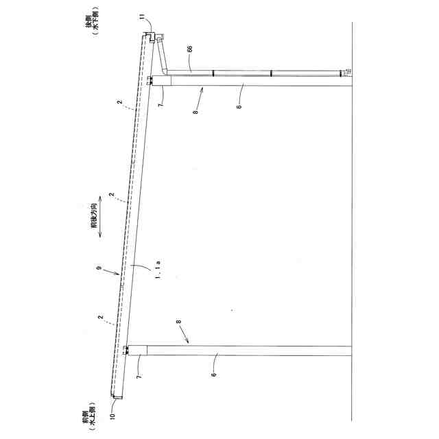 屋根9は、図1,2に示すように、前後方向に並ぶ2本の梁7上に複数の垂木1,1,…を左右方向に一定の間隔をおいて架設し、複数の垂木1,1,…の水上側端部に前枠10を架設し、複数の垂木1,1,…の水下側端部に樋(枠)11を架設し、各垂木1,1,…間にソーラーパネル2を架設して構成してある。ソーラーパネル2は、左右方向に5枚、前後方向に3枚並べて取付けてある。ソーラーパネル2は、図3,4に示すように、矩形に組んだフレーム12と、フレーム12の内側に保持した太陽電池パネル13とを有している。