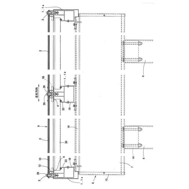 柱6は、略正方形断面のアルミ形材で形成してあり、下部を地面に埋め込んで周囲をモルタルで固めて垂直に立設してあり、柱6の上端は、図3に示すように、連結金具14を介して梁7の下面に固定してある。柱6の上端は、梁7の下面で梁7の長手方向の任意の位置に連結することができ、柱6は設置位置を左右方向に移動させることができる。
