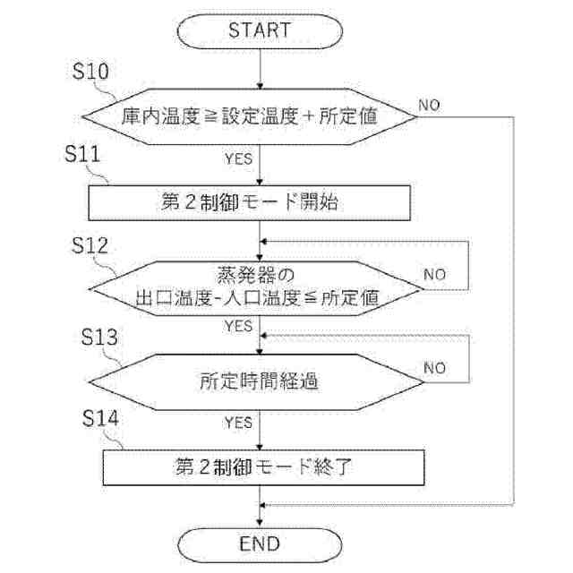 制御部は、冷却室内の温度や状態が所定条件となった場合に、制御モードを通常運転時の制御方法である、庫内温度センサで検出した温度と設定温度との差に基づいて制御する第1制御モードから、蒸発器出口センサで検出した温度と蒸発器入口センサで検出した温度との差に基づいて制御する第2制御モードに切り替える。