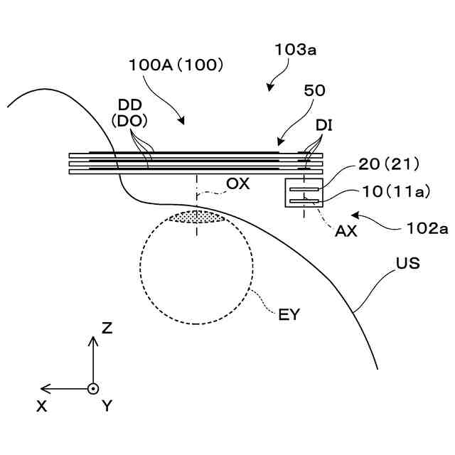 図1は、頭部装着型表示装置(以下、ヘッドマウントディスプレイ又はHMDとも称する。)200の装着状態を説明する図である。HMD200は、これを装着する観察者又は装着者USに虚像としての映像を認識させる。図1等において、X、Y、及びZは、直交座標系であり、+X方向は、HMD200を装着した観察者又は装着者USの両眼EYの並ぶ横方向に対応し、+Y方向は、装着者USにとっての両眼EYの並ぶ横方向に直交する上方向に相当し、+Z方向は、装着者USにとっての前方向又は正面方向に相当する。±Y方向は、鉛直軸又は鉛直方向に平行になっている。
