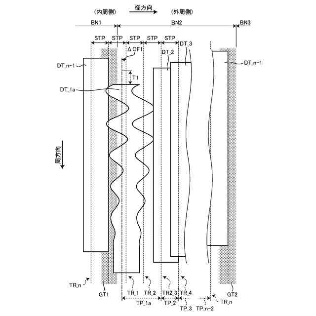 前記第1のトラック、前記第2のトラック、前記第3のトラックを含む前記バンドの半径位置に応じて、前記第1のトラック及び前記第2のトラック間のトラックピッチを前記第2のトラック及び前記第3のトラック間のトラックピッチより大きくするトラック配置の実施又は非実施を、前記少なくとも1つのバンドのそれぞれについて選択可能である