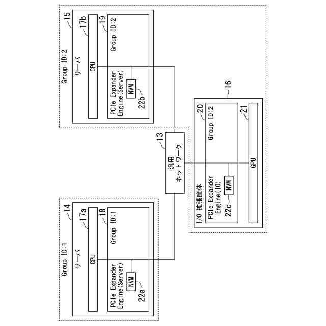 GPUのコストを削減する方法として、MR-IOV(Multi Root I/O Virtualization)によってGPUを搭載したデバイスを共有する方法が挙げられる。MR-IOVは専用のPCIe(Peripheral Component Interconnect Express) Switchを使用し、複数OS間でPCIeデバイスを共有することができる規格である。しかし、専用のPCIe Switchは高価であり、汎用性に欠ける。安価なEthernet Switchを用いて実現可能な方法として、PCIe over Ethernet技術によるGPUのマイグレーションが挙げられる。PCIe over Ethernet技術は、サーバ内部の様々なPCIeデバイスの接続に用いられているPCIeのインターコネクトをEthernetのような汎用ネットワークに拡張することができる技術である。図3にシステム構成例を示す。サーバ14には、CPU17a、PCIe Expander Engine(Server)(以下、EE(Server)と記載)18が搭載され、EE(Server)18はNVM(不揮発メモリ)22aを有している。同様に、サーバ15には、CPU17b、EE(Server)19が搭載され、EE(Server)19はNVM22bを有している。I/O拡張筐体16は、GPU21と、PCIe Expander Engine(IO)(以下、EE(IO)と記載)20が搭載され、EE(IO)20はNVM22cを有している。EE(Server)18、19はサーバ側の機能を持ち、EE(IO)20はI/O側の機能を持つ。サーバ14、15とI/O拡張筐体16は汎用ネットワーク13に接続されている。EE(Server)18、19、EE(IO)20は、汎用ネットワーク13を介して互いに通信を行う。EthernetでPCIeのパケットを転送する場合、PCIeのパケットをEthernetのフレームにカプセル化して転送を行う。NVM22a~22cはGroup IDを保持し、同じGroup IDを保持するEE(Server)とEE(IO)間で接続する。例えば、図3の例では、NVM22aとNVM22cがGroup ID=1を保持し、NVM22bがGroup ID=2を保持するため、EE(Server)18とEE(IO)20が接続される。汎用ネットワーク3にEthernetを使用する場合、VLANの設定を使用し、設定することができる。例えば、EE(IO)20のGroup IDを、稼働中のサーバのEE(server)18のGroup ID=1から移行先のサーバのEE(Server)19のGroup ID=2に変更することで図4に示すように、I/O拡張筐体16の接続先をサーバ14からサーバ15に変更することができる。