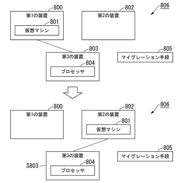 【解決手段】システムは、仮想マシンが稼働する第1の装置と、前記仮想マシンのマイグレーション先となる第2の装置と、前記第1の装置と接続し、前記仮想マシンに割り当てられたプロセッサを搭載する第3の装置と、前記第1の装置から第2の装置に前記仮想マシンをマイグレーションする手段と、を備え、前記マイグレーションする手段は、前記仮想マシンを前記第1の装置から前記第2の装置にマイグレーションする際に、前記第3の装置を前記第1の装置から切り離して、前記第2の装置に接続し、前記第2の装置にマイグレーションされた前記仮想マシンに前記プロセッサを割り当てて起動する。