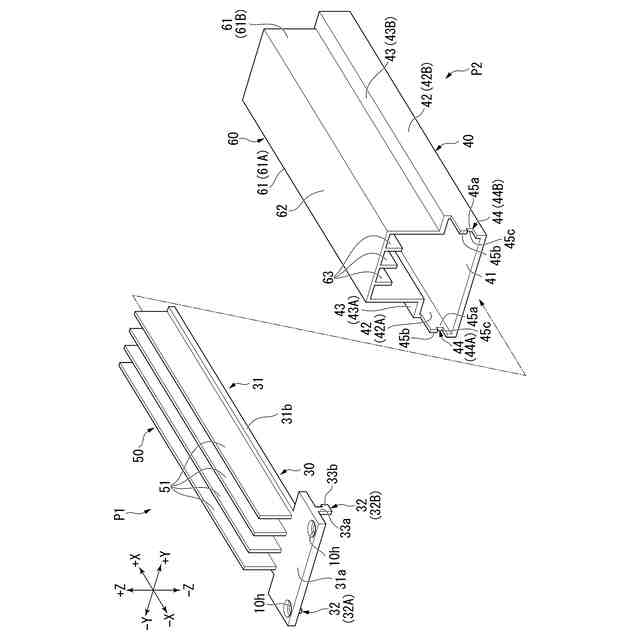 本出願では、+X方向、-X方向、+Y方向、-Y方向、+Z方向、および-Z方向は、以下のように定義される。+X方向、-X方向、+Y方向、および-Y方向は、後述する基板21の第1面21aと平行な方向である(図2参照)。+X方向は、筐体10の第1端部10e1から第2端部10e2に向かう方向である(図1参照)。-X方向は、+X方向とは反対の方向である。+X方向と-X方向とを区別しない場合は、単に「X方向」と称する。+Y方向および-Y方向は、X方向とは交差する(例えば直交する)方向である。+Y方向は、後述する筐体10の一方の側壁(第3壁42A)から他方の側壁(第3壁42B)に向かう方向である(図1参照)。-Y方向は、+Y方向とは反対の方向である。+Y方向と-Y方向とを区別しない場合は、単に「Y方向」と称する。+Z方向および-Z方向は、X方向およびY方向とは交差する(例えば直交する)方向である。+Z方向は、後述する筐体10の第2壁41から第1壁31に向かう方向である(図1参照)。-Z方向は、+Z方向とは反対の方向である。+Z方向と-Z方向とを区別しない場合は、単に「Z方向」と称する。Z方向は、基板21の厚さ方向である。Z方向は、「第1方向」の一例である。+Z方向側は、「第1側」の一例である。-Z方向側は、「第2側」の一例である。Y方向は、「第2方向」の一例である。