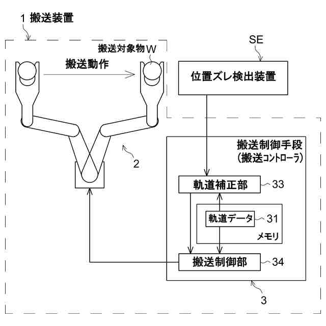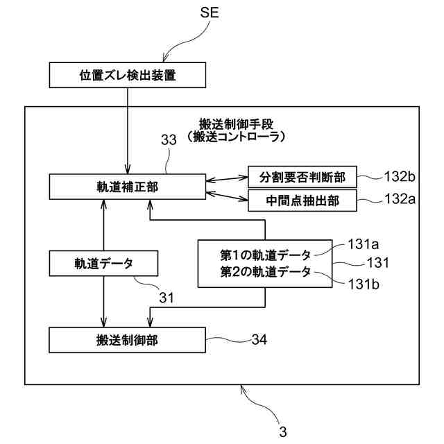 【解決手段】目標となる終点E’が搬送軌道Ptの終点Eから位置ずれしている場合に搬送軌道Ptの終点Eが目標終点E’となるように搬送軌道Ptを補正する軌道補正部を具備し、軌道補正部は、搬送開始位置を始点とし搬送停止位置を終点とする軌道の補正では途中に軌道の逸脱が生じる場合に、搬送開始位置TSと搬送停止位置TEの間に中間点Mを設定し、搬送開始位置TSを始点Sとし中間点Mを終点Eとする第1の軌道Pt1と、中間点Mを始点Sとし搬送停止位置TEを終点Eとする第2の軌道Pt2に分けて、軌道の補正を行う。